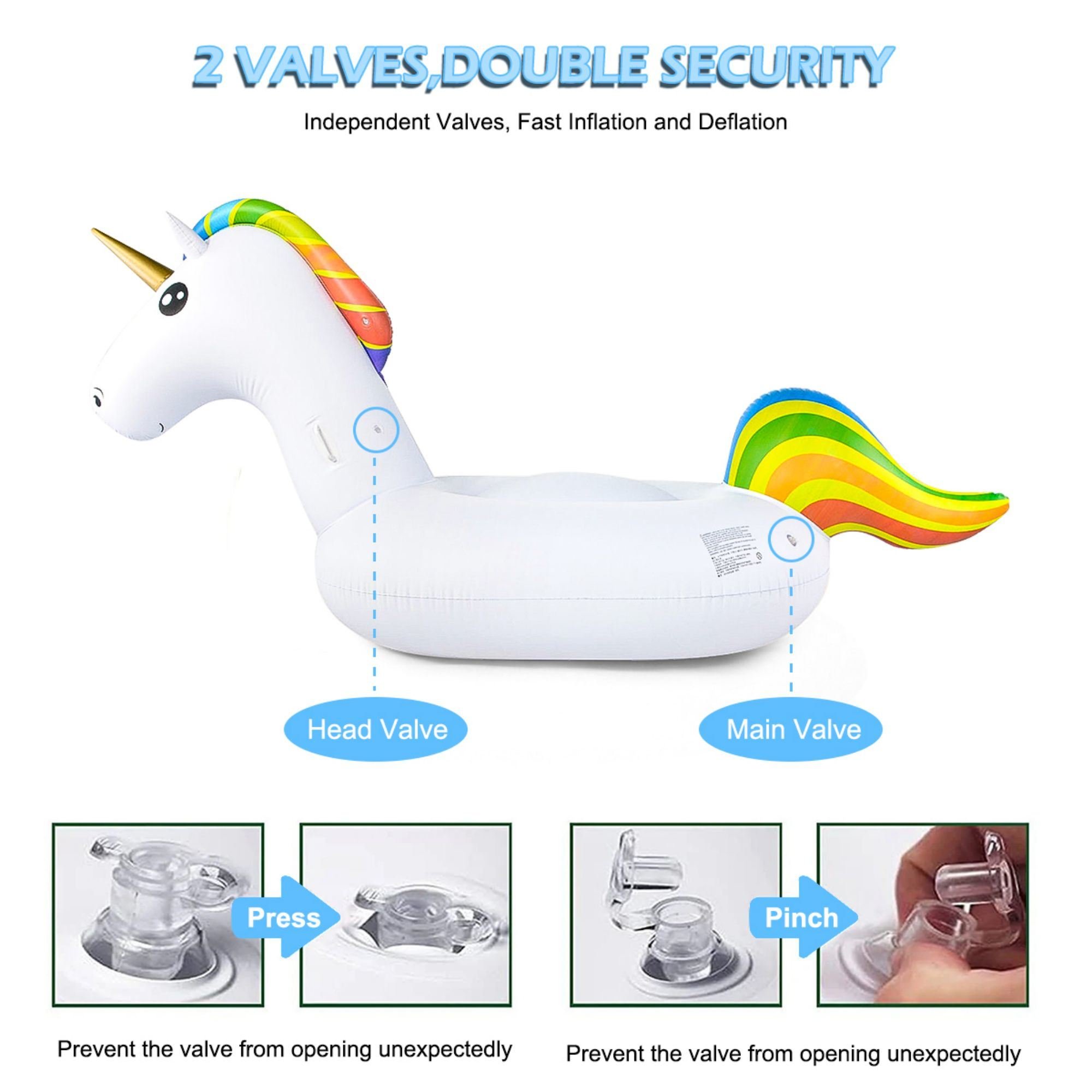 product details Large unicorn inflatable swimming pool float party toys; summer beach float swimming pool inflatable ride style swimming pool toy raft lounge suitable for children and teenagers. Interesting large swimming pool toy with dual valves. Unicorn swimming pool floater; swimming pool inflatable flashing raft is suitable for swimming pool giant swimming pool floating raft beach swimming pool floater with quick valve for adults and children; swim ring inflatable floating beach swimming pool pipefeatures:[Giant Rainbow Unicorn Pool Float] Suitable for accommodating 1-2 adults or 2 children; up to 441 pounds. The dimensions are 76.7 inches (length) x 35.4 inches (width) x 41.3 inches (height). Cute unicorn design with rainbow colored hair and tail.[Multi safety design] Made of durable plastic material thickened by 0.25mm. Double inflation ports to prevent air leakage. The durable handle ensures your safety when floating on water.[Quick inflation and deflation] Three large quick inflation ports on the rainbow fur; neck; and tail allow for quick inflation and deflation. Easy to store and carry.A comfortable large pool float or pool lounge; allowing you to relax in the sun or play with pool party decorations.[Summer Water Fun] Suitable for swimming pools; lakes; rivers; pool parties; summer themed parties; outdoor water fun; beach floating; pool toys; leisure rafts; and more! A birthday or summer gift suitable for children and adults. The floating effect is very good. That's great for a three year old child!Information:Style: UnicornProduct size: L x W x H 10.39 x 6.73 x 2.87 inchesItem packaging size L x W x H: 10.39 x 6.73 x 2.87 inchesPackaging weight: 1.21 kgItem weight: 2.67 poundsMaterial: PlasticYou can enjoy the fun of floating in swimming pools; beaches; lakes; or rivers throughout the summer.The inflatable unicorn design can accommodate 1-2 adults and weighs over 350 poundsThe unicorn sequins are made of environmentally friendly PVC material; which is thick; soft; and durable.The two handles on the unicorn's neck are used for safe driving.Quick valve; increases inflation and deflation speed by more than 5 times