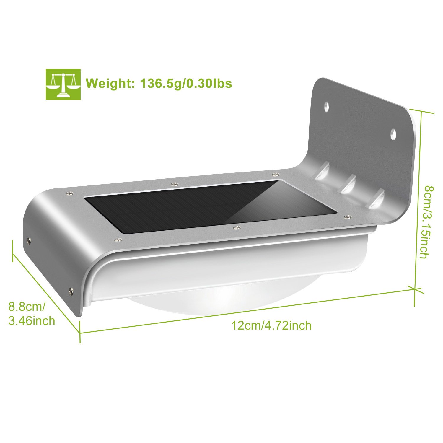 **16 LEDS ULTRA-BRIGHT SOLAR POWERED LIGHTS*:Inbuilt 16 SMD2835 LEDs with 240lm maximum output and sensitive motion sensor with 120° wide sensing angle which provide up to 180° illumination range and turn the dark space into a bright lighted space for security and safety protection.